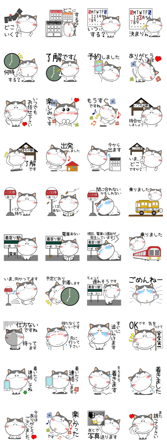 待ち合わせ用スタンプ。計画段階から当日の連絡、事後の連絡まで一揃い。文字も大きめで見やすい。シンプルなのでずっと使える。使いやすい。