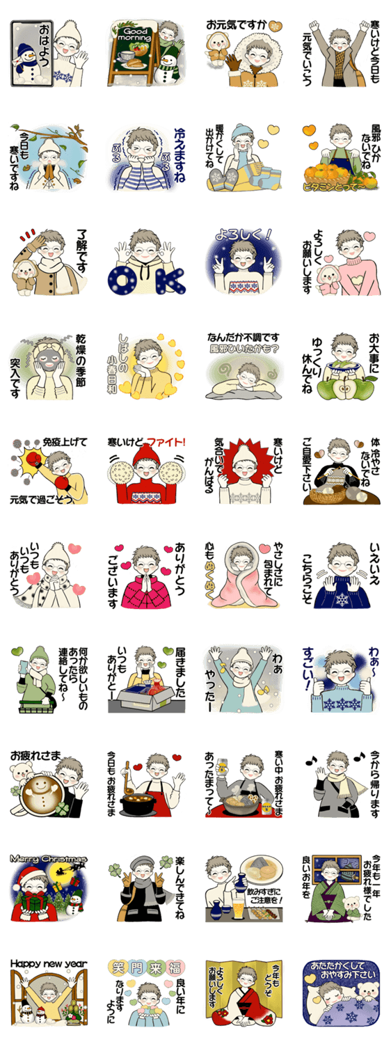 冬に使いやすい心温まる日常スタンプです。ほっこりやさしいメッセージをお届けください。年末年始のご挨拶にも。冬/日常/挨拶/クリスマス/大晦日/お正月/年末年始/敬語