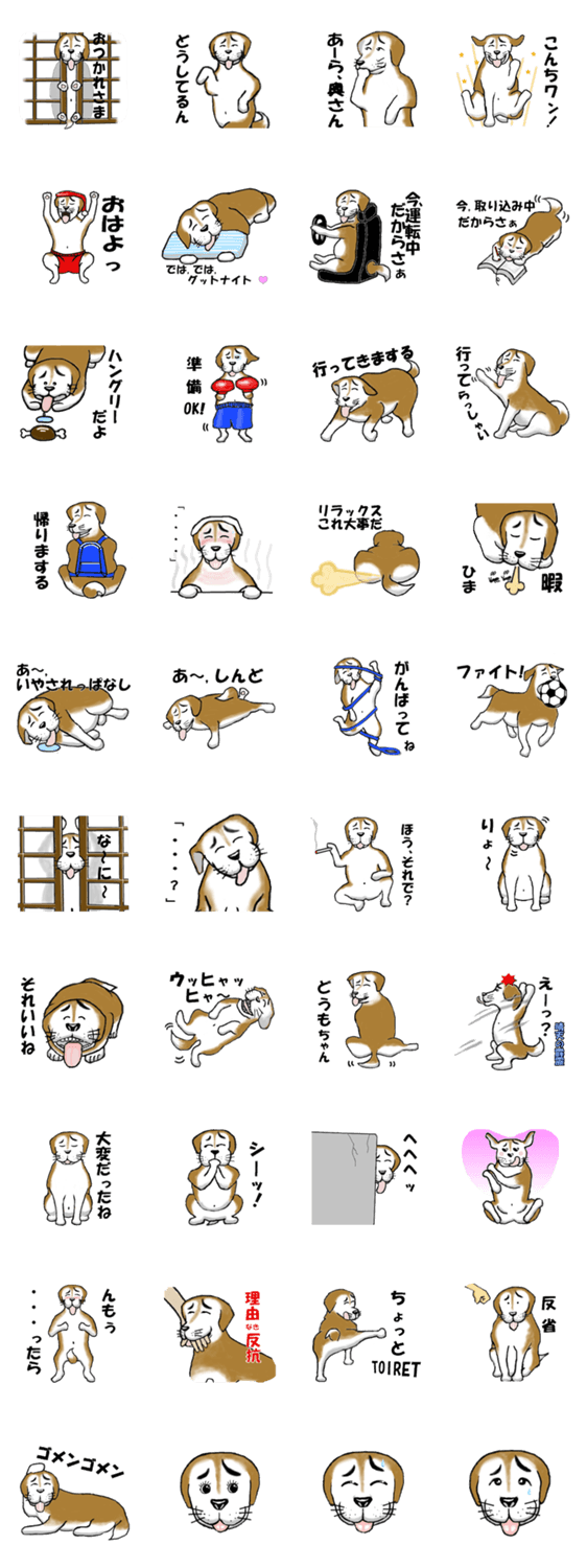 | スタンプ説明 | タロウは、すっとぼ犬という犬種のとぼけた犬です。歳のころはおじさんで、このスタンプもおじさん仕様に見やすくわかりやすく作りました。 |