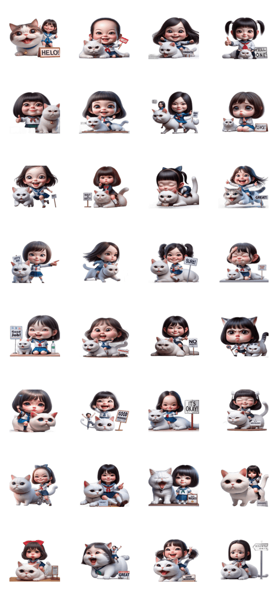 猫に乗る少女絵文字ステッカー、当然、驚き、ユーモア、LINEスタンプ、イラスト、可愛い、コミュニケーション