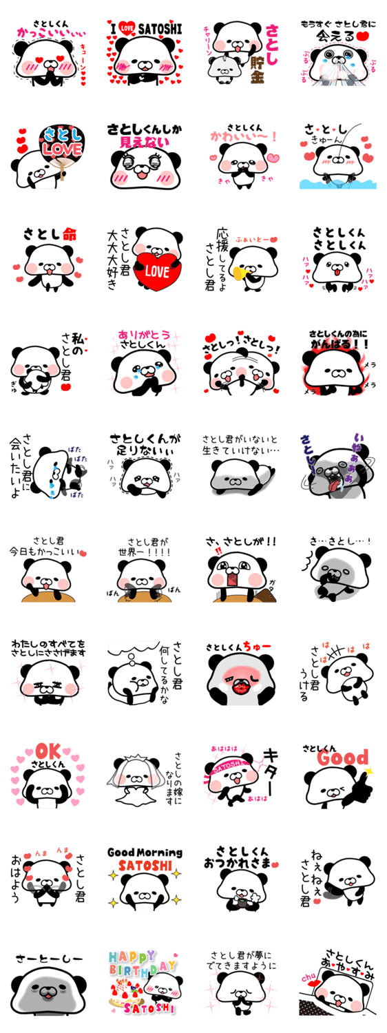 今日も大好きな「さとし」君を想って一日頑張るあなたへ。さとし君への気持ちをパンダのキャラクターで伝えられる、さとしくん(智くん、聡くんetc…)専用スタンプです。