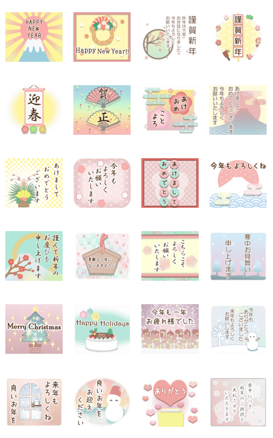毎年使える年末年始のポップアップスタンプです。お正月だけでなく、クリスマスや年末、年越し、喪中の挨拶に使えるスタンプも入ってます。こちらのスタンプは再販です。