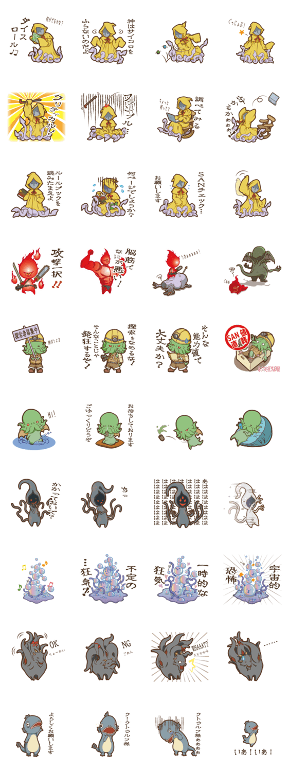 クトゥルフ神話をモチーフにした名状し難いスタンプ第4弾。T-RPGで遊ぶときのお供にいかがでしょうか?