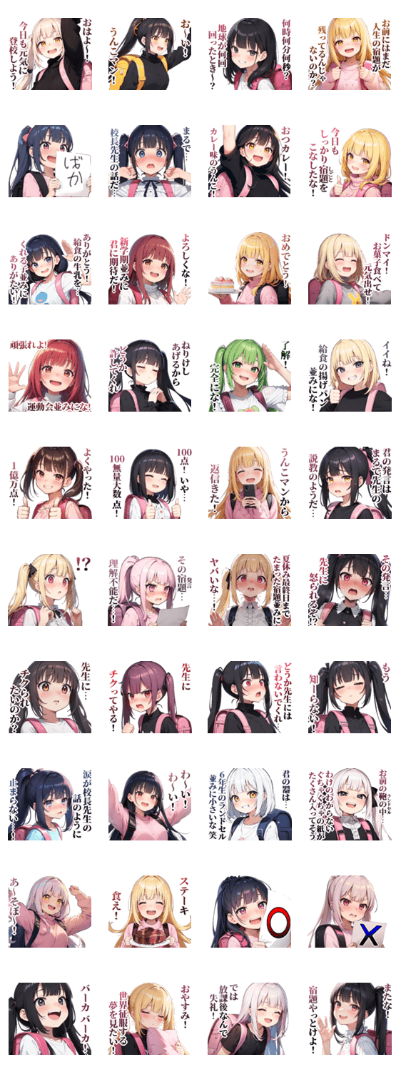 ランドセルの女の子たちのウザい感じのスタンプです。小学生特有のクソガキ感のある台詞をどうぞ。煽り、かわいい、可愛い、子供、校長先生、宿題、メスガキ、うんこ。