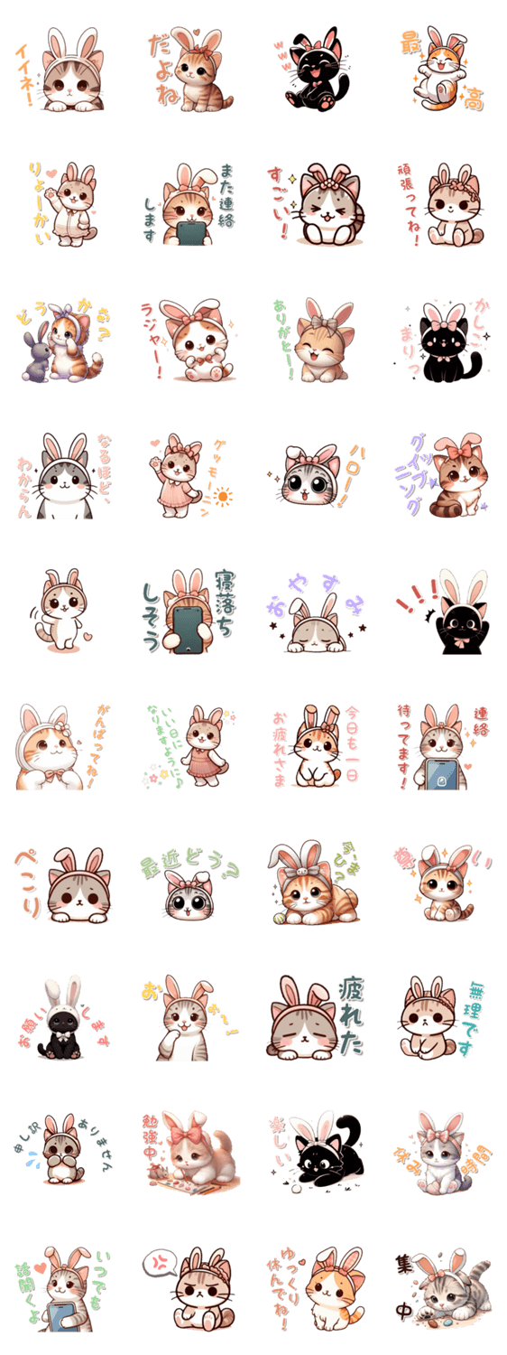 | スタンプ説明 | うさ耳をつけたかわいい猫のスタンプ3です。毎日使える定番メッセージ、よく使う言葉!うさみみ✕にゃんこで可愛さ2倍!黒猫、ハチワレ猫、茶トラ猫、ブチ猫、三毛猫など! |