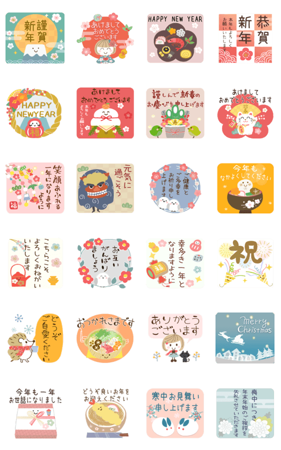 毎年使える年始年末のご挨拶スタンプです。 ※過去作のアレンジ・再販スタンプとなります。 クリスマス/お正月/年末年始/寒中見舞い