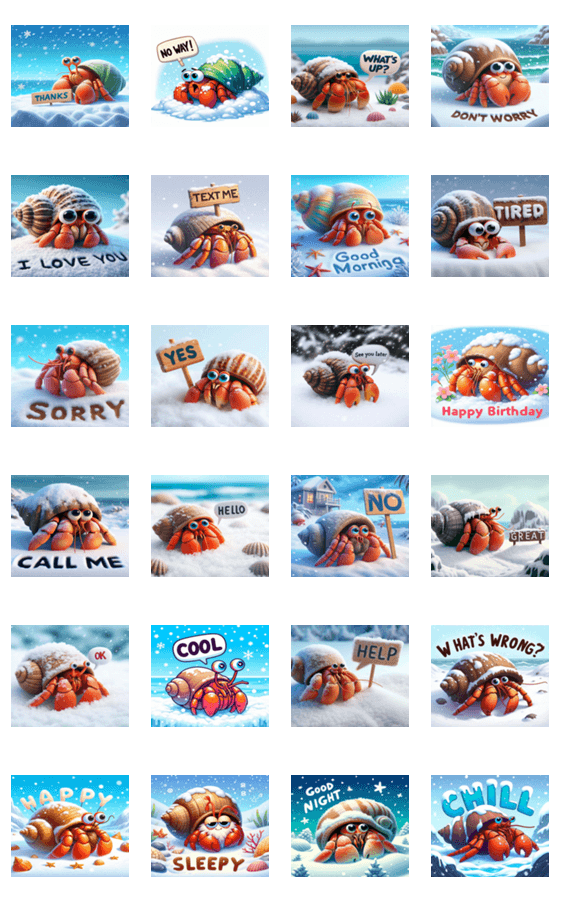 雪の中でほのぼのとしたヤドカリが楽しめるスタンプセットです。冬の会話にぴったり!