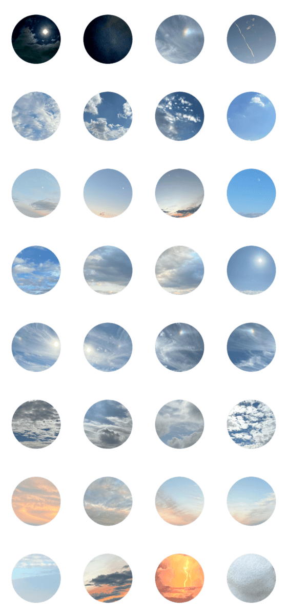 色々な場所、時間のキレイな空のスタンプです。(綺麗.月.満月.月光.夜空.星空.夜.星.スーパームーン.雷.雲.天気.半月.稲妻.オシャレ.青空.きれい.晴れ.幻日.飛行機雲.雪)