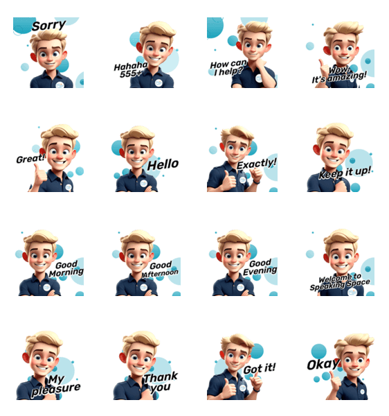 | スタンプ説明 | A confident native teacher with a bright and charming smile, bringing energy and professionalism to every conversation! |