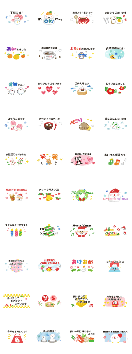 冬に使える幅の狭い小さいサイズのスタンプです!コンパクトでトークを圧迫しない。年賀状代わりにも!クリスマス/寒い/よいお年を/お正月/あけおめ/今年もよろしく