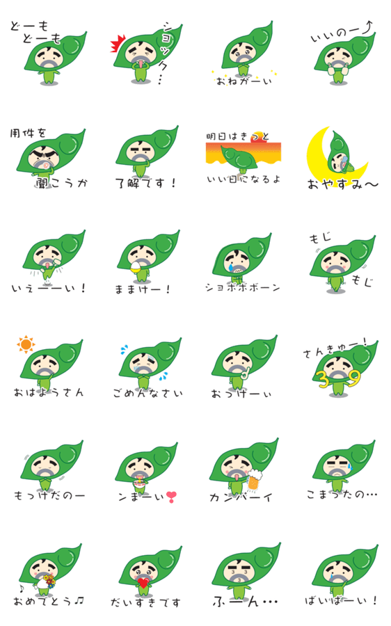 山形県は庄内地方を勝手に応援するキャラクター「だだちゃん」のスタンプです。 だだちゃんは鶴岡市名産「だだちゃ豆」の妖精だよ♪ 好きな食べ物はラーメンです!