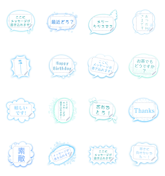 文章を書き込めるので自由にトークできます★雪が解けたような吹き出しからクリスマスツリーや雪の結晶など冬を感じる白とブルーのきれいなメッセージスタンプ♪ 現在この商品は一部のスマートフォン版LINE 10.3.0以上のトークルームでのみ使用できます。動作環境の最新情報はヘルプをご確認ください。