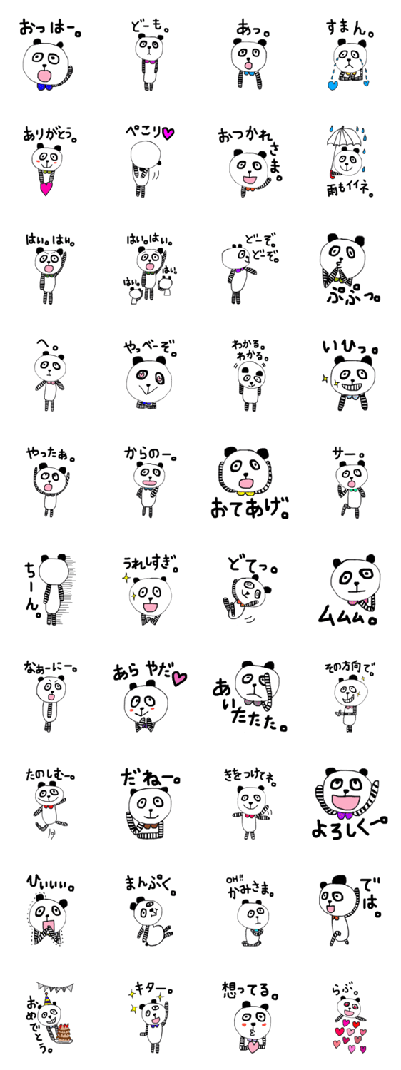 | スタンプ説明 | 可愛いパンダがお返事しちゃうよ。手と足がボーダーで可愛いの。 |