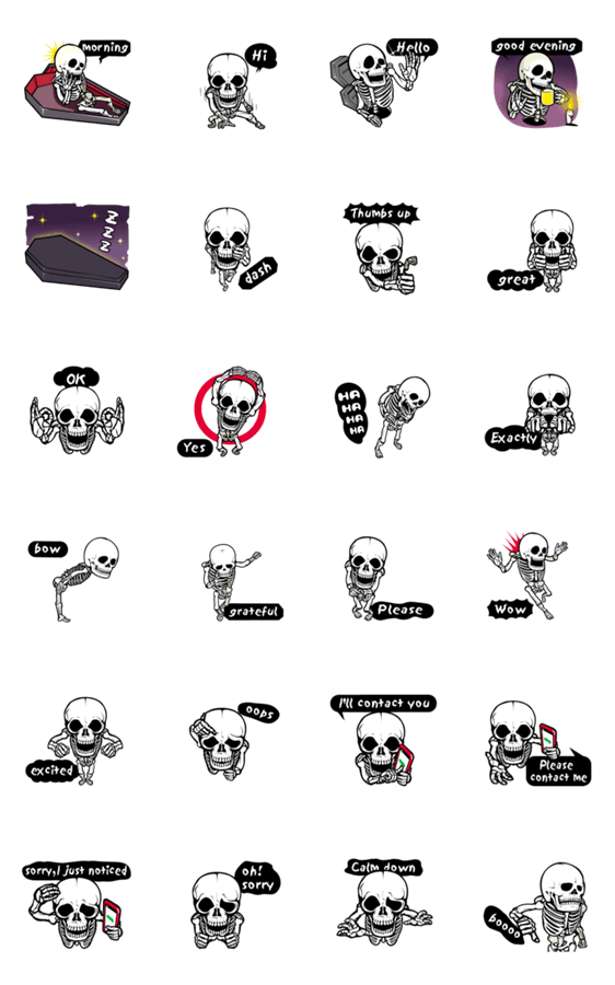デフォルメ版「笑う骨」の毎日使えるシンプルなスタンプです。文字なし版と日本語版もあります。
