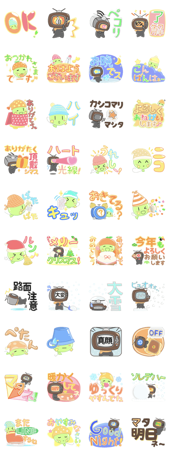 頭がテレビな「テレビアタマ」& 帽子をかぶった のんびり風船「ふわふう」の 冬と 日常 & カラフル デカ文字の スタンプです! あけおめ & クリスマスも収録しています♪