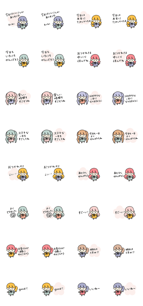 ちっちゃな女の子たちがほめたり励ましたり、期待したりします。日常的に使いやすいひとことを集めました。