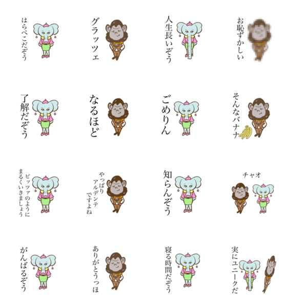 | スタンプ説明 | イタリア生まれのゴリラとゾウのシュールなスタンプです |