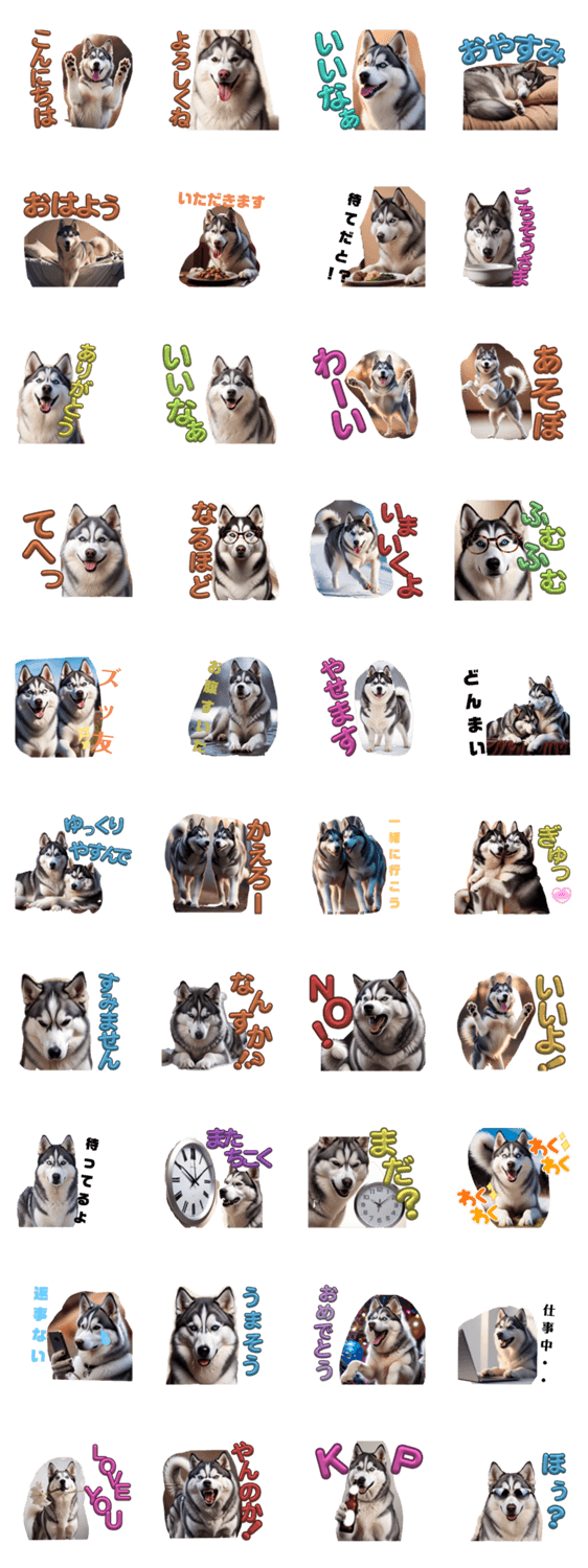 リアルなシベリアンハスキーのスタンプです。すこしおばかでかわいくかっこいいな犬のスタンプを日常会話やあいさつに活用してください!