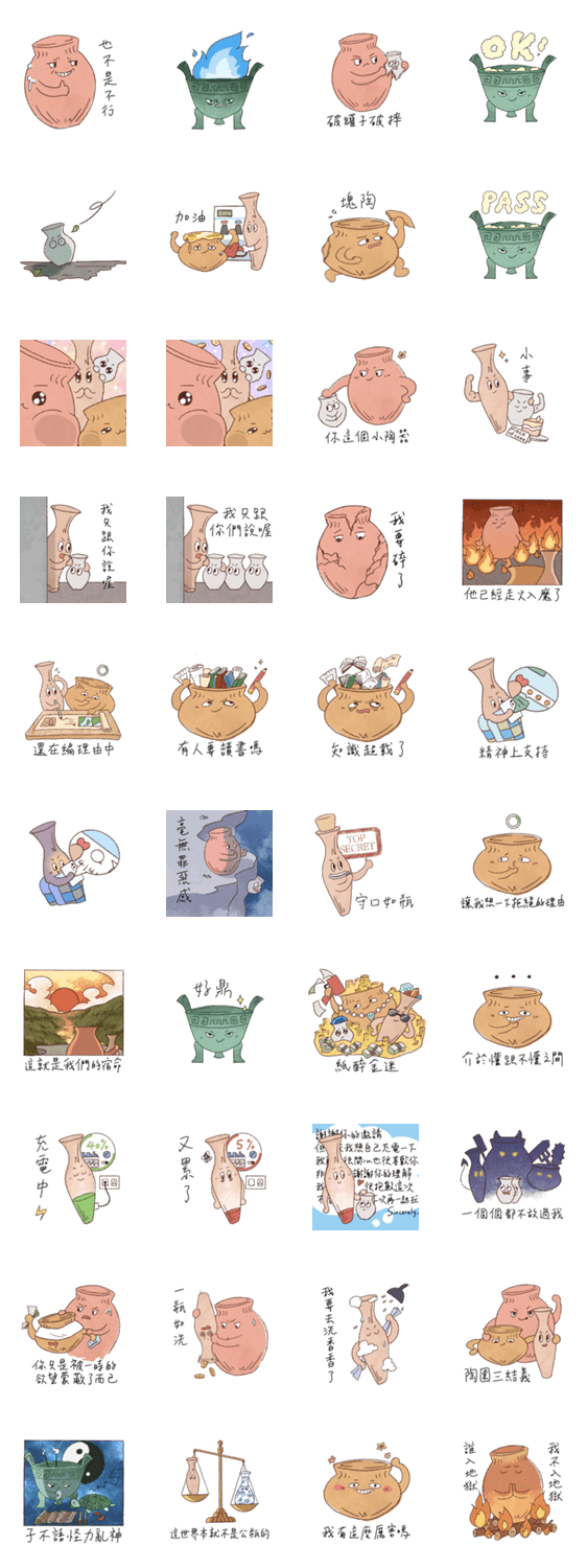 | スタンプ説明 | Meet the pottery crew from Neolithic Taiwan! There's "Boss Pot" the big one, "Slim Neck" the tall one, "Flat Sage" the wide one, and "Lil Rascal" the tiny one. |