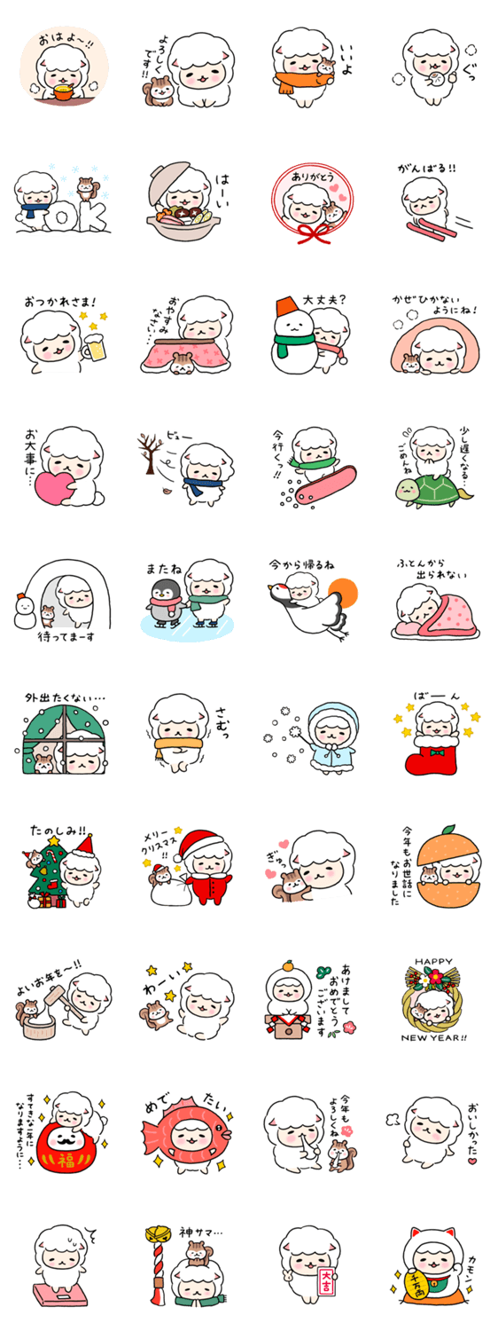 ふわふわでたれ目の癒し系ひつじ、いやひつじの冬のあれこれスタンプ。クリスマスや年末年始、お正月のご挨拶など。