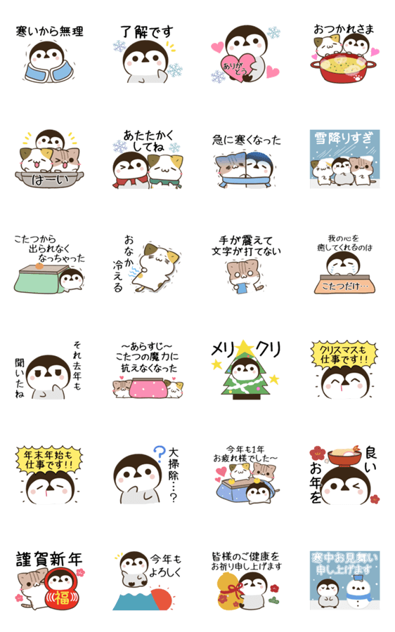 お疲れ気味やる気が出ない時にゆるかわ三毛猫とキジトラ白猫とペンギンのアニメーションスタンプ 仕事 連絡 家族 敬語 正月 クリスマス 年末年始 こたつ 雪 冬 寒中見舞い