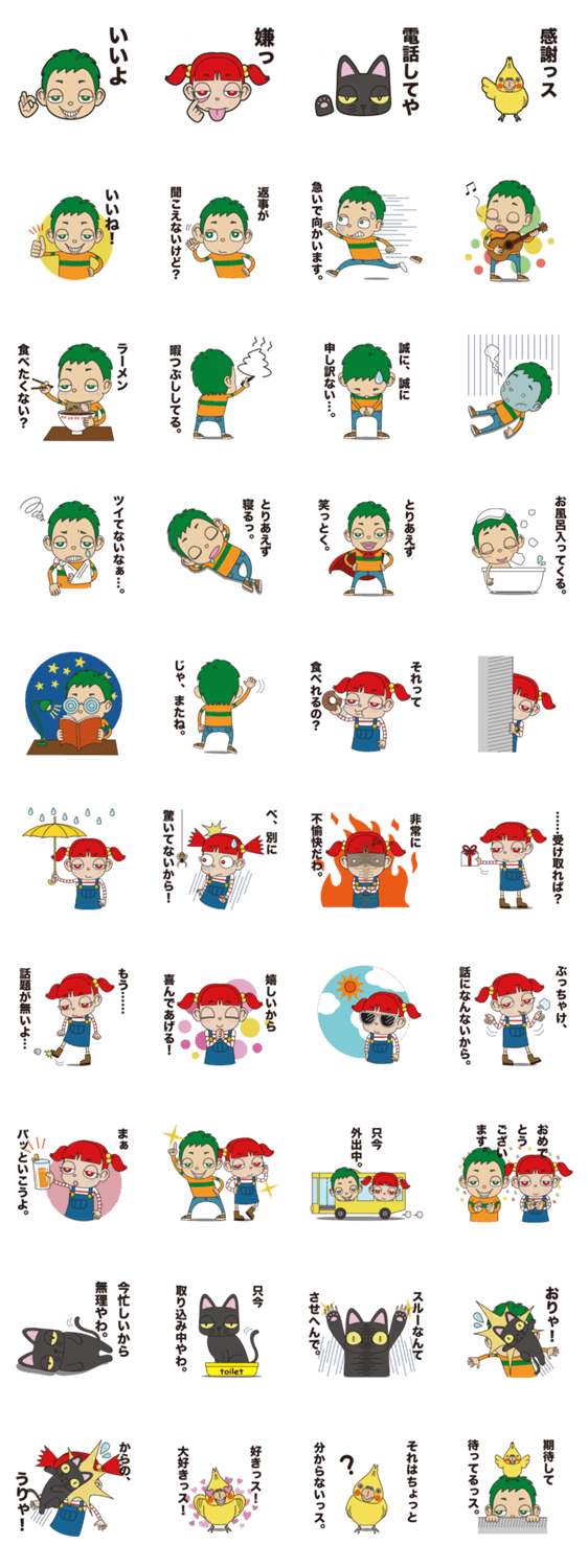 | スタンプ説明 | 世界のどこかの小さな町。お調子者のマサオくんと、おませなユメちゃん。野良猫のクロ、ぼんやりインコのキイロ。町で暮らすそんな彼らの日常をスタンプにしました。 |