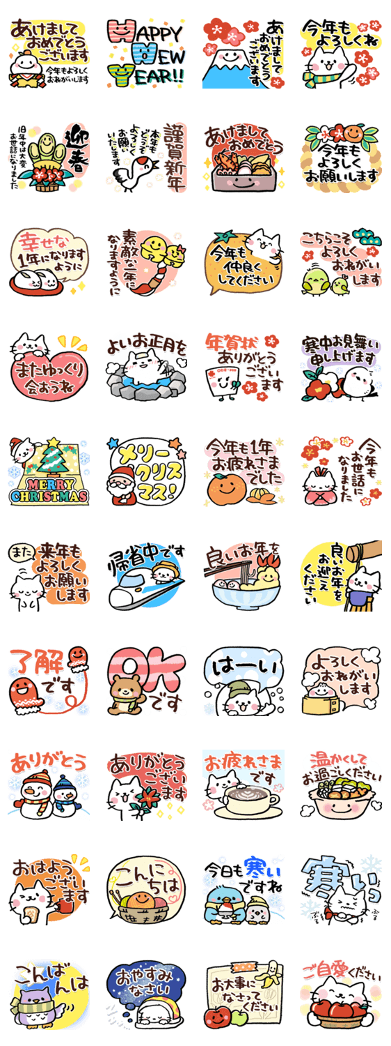 冬にたっぷり使えるかわいい日常挨拶スタンプです。クリスマスから年末年始・お正月まで♪ 大人/年賀状/見やすい/デカ文字/敬語/大晦日/あけおめ/毎年使いやすい/