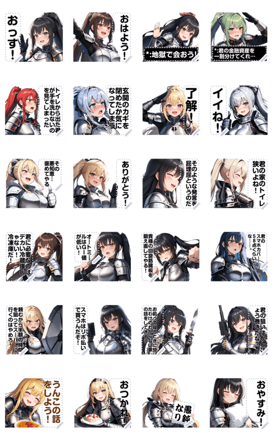 好きな文字を入れて使える女騎士のメッセージスタンプです。文章全て変更可能です。可変。美少女、可愛い、かわいい、カワイイ、ナイト、鎧、アーマー、ファンタジー、ネタ 現在この商品は一部のスマートフォン版LINE 10.3.0以上のトークルームでのみ使用できます。動作環境の最新情報はヘルプをご確認ください。