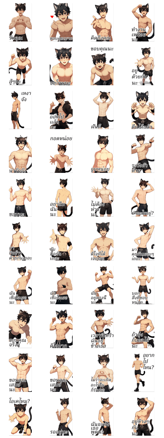 | スタンプ説明 | This male character looks human but has cat ears and a tail. I hope to accompany you and increase the fun of chatting with you! These stickers will show up extra large in chats. |