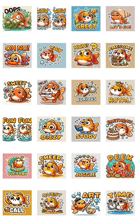 さまざまな感情やシーンを表現したポンコツ金魚のスタンプセットです。チャットにぴったり!