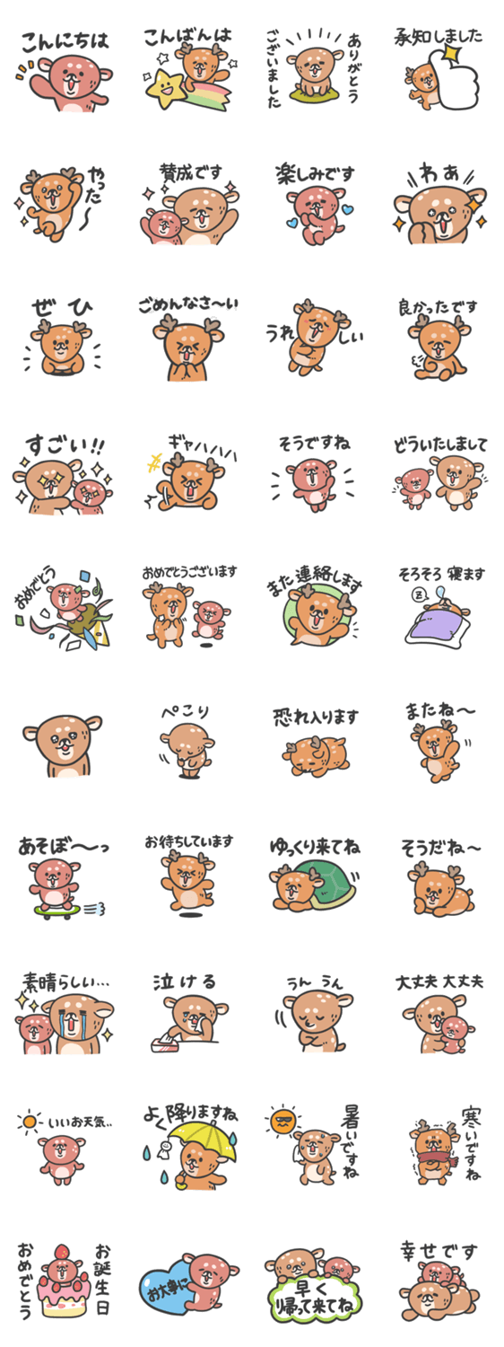 ゆるかわ鹿さんスタンプの第二弾です。小さくてかわいい子鹿ちゃんも登場。日常で使いやすいイラストと文字を集めました。