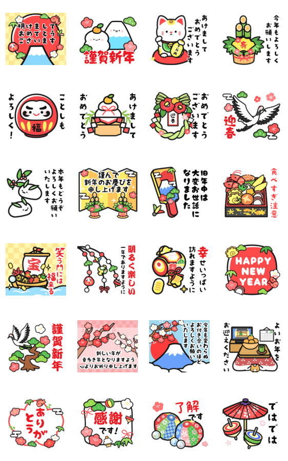 | スタンプ説明 | 誰でも使えるシンプルなお正月スタンプです。 あけましておめでとう,お正月,年末年始,新年,あけおめ,年越し,大晦日,謹賀新年,年賀状,様々な場面でのご挨拶に使ってね♬ |