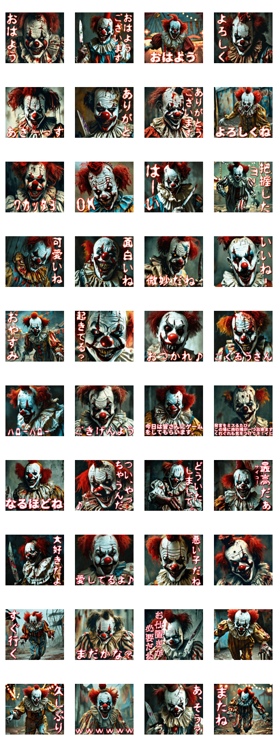 待望の、狂気ピエロがコンパクトな日常スタンプとして登場!ちょっとだけ日常がホラーになります。慣れるとカワイく見えてくるかも?/挨拶/返信/丁寧/