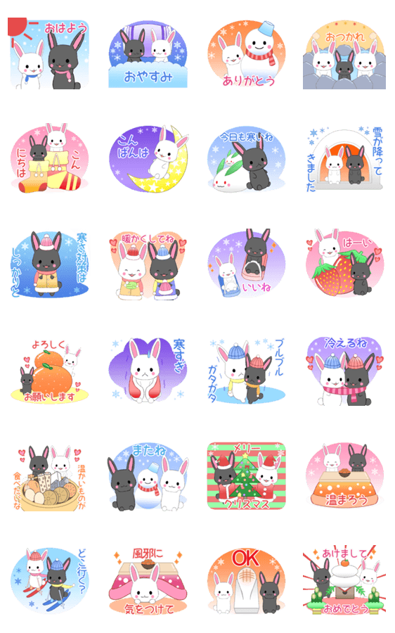 小さいうさぎたちのポップアップスタンプ第11弾。兎/ウサギ/白兎/黒兎/カワイイ/可愛い/キュート/もふもふ/モフモフ/挨拶/日常会話/気持ち/感情/雪/クリスマス