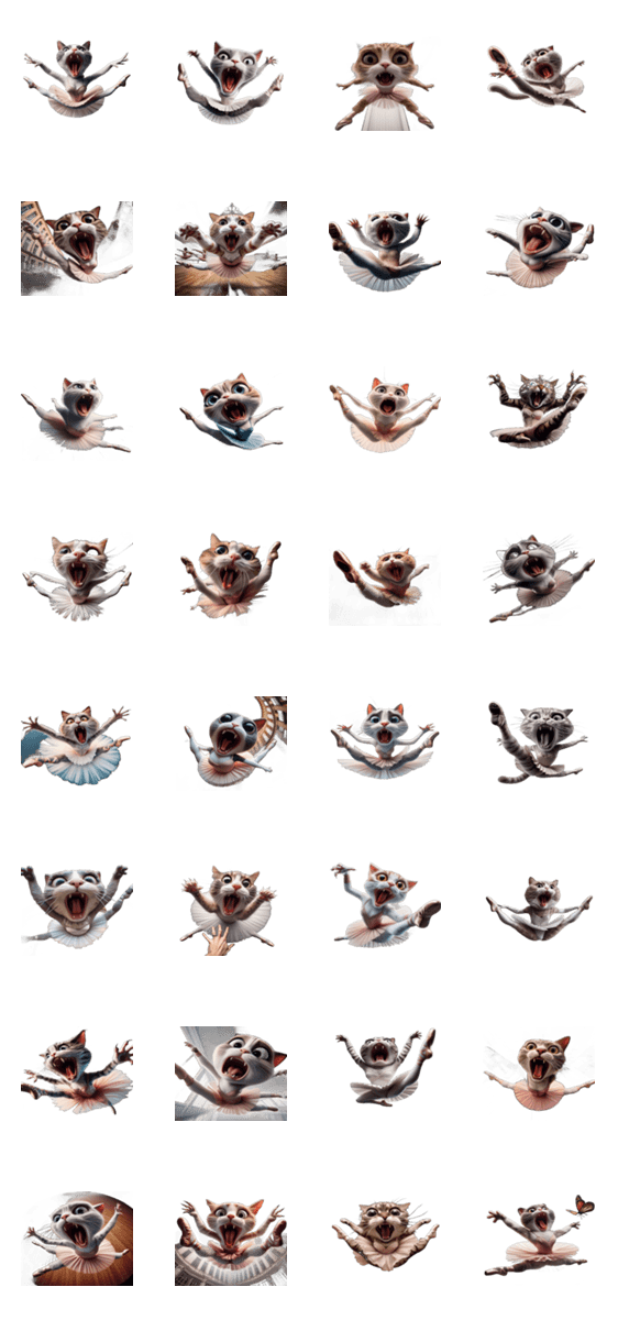 バレエキャットが驚く表情、優雅、感情、ダンス、カートゥーンスタイル、LINEスタンプ、イラスト、コミュニケーション、チャット