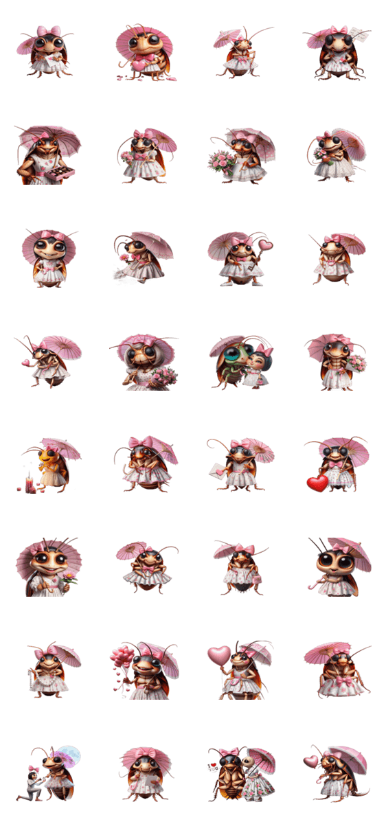 面白いゴキブリ女子スタンプ、キス、ロマンス、ユーモア、昆虫、かわいい、楽しい、LINEスタンプ、イラスト、交流