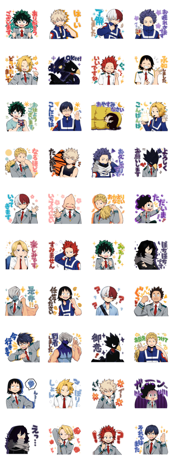 僕のヒーローアカデミアコラボの毎日使える敬語篇スタンプです!出久、爆豪、轟、切島、瀬呂、相澤、心操など雄英高校1-A男子の挨拶やリアクションが沢山入っています。 ※LINE Creators Collaboration 僕のヒーローアカデミア参加スタンプです。