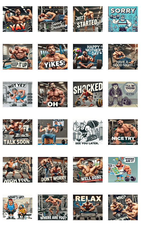 どこか抜けているボディービルダーの面白いスタンプセットです。会話に笑いを!