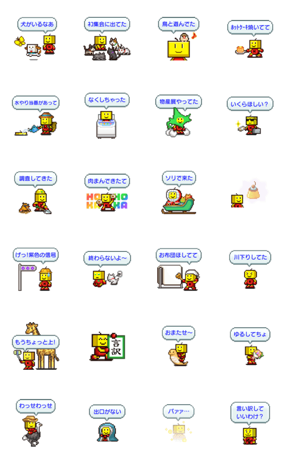 カイロソフトのドット絵のスタンプだよ。うまい言い訳をするカイロくんを使ってその場を切り抜けよう。
