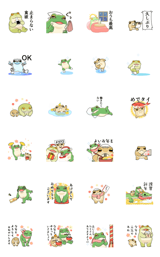 2024のあけおめカエルの再販です。 ゆるく年越ししたいカエル 年末年始以外でも使えるスタンプ多めです!