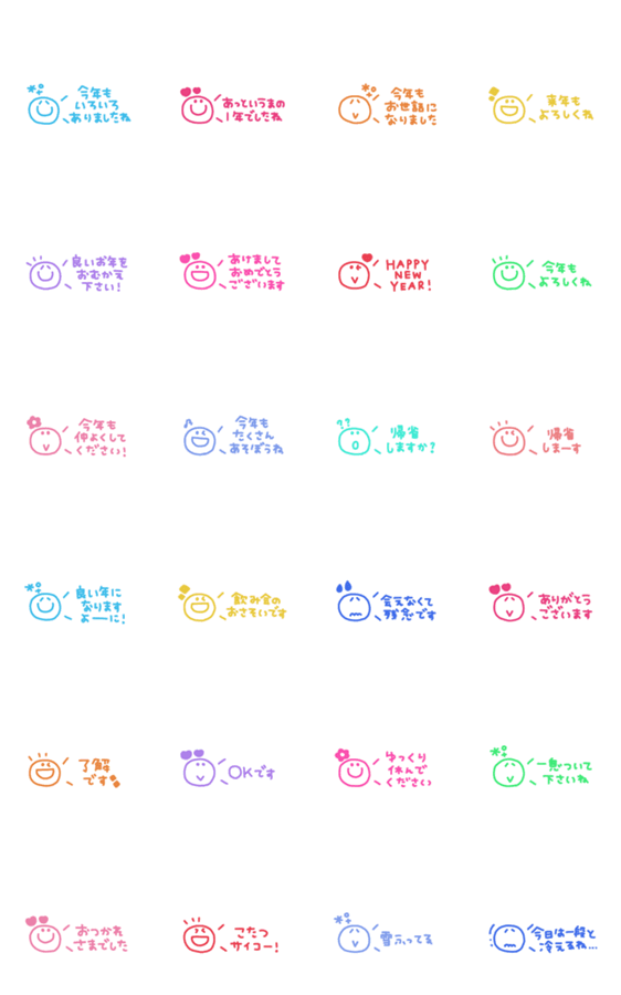 このスタンプは2024年の再販です。カラフルなスマイルのあいさつスタンプです。 あいさつ/スマイル/省スペース/シンプル/年末年始