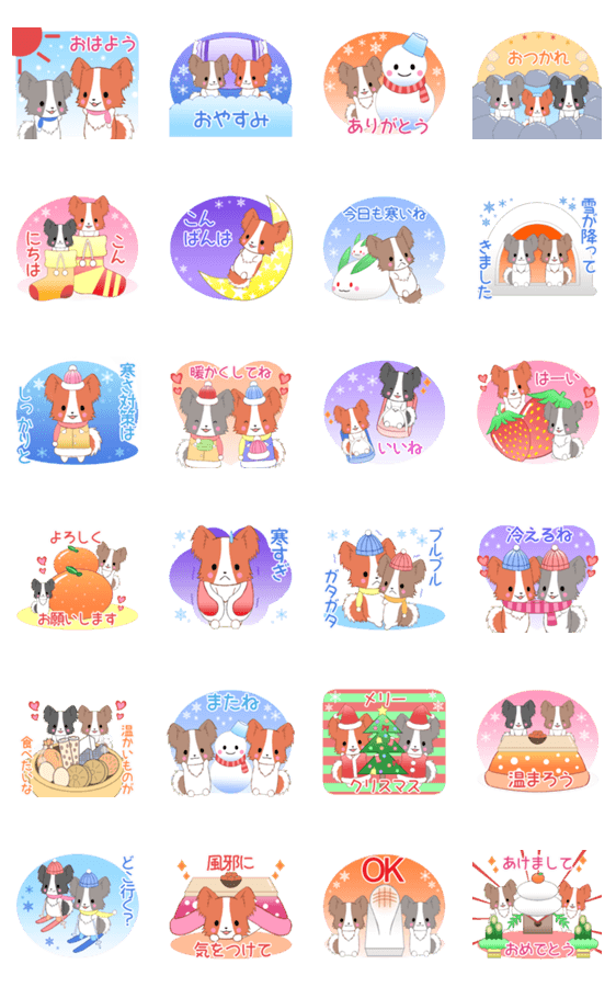 小さいパピヨンたちのスタンプ第15弾。レッド/セーブル/ブラウン/ブラック/カワイイ/可愛い/キュート/犬/イヌ/もふもふ/モフモフ/挨拶/日常会話/気持ち/感情/雪/クリスマス