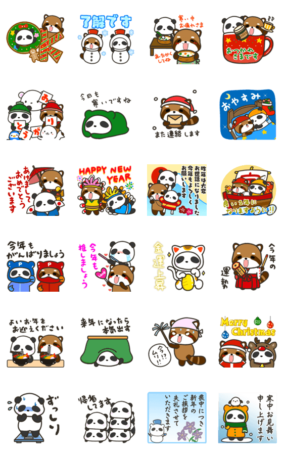 面白くて可愛いレッサーパンダとジャイアントパンダの冬に便利な年末年始のエフェクトスタンプです。お正月/大晦日/喪中/寒中お見舞い/クリスマ/毎日使える言葉
