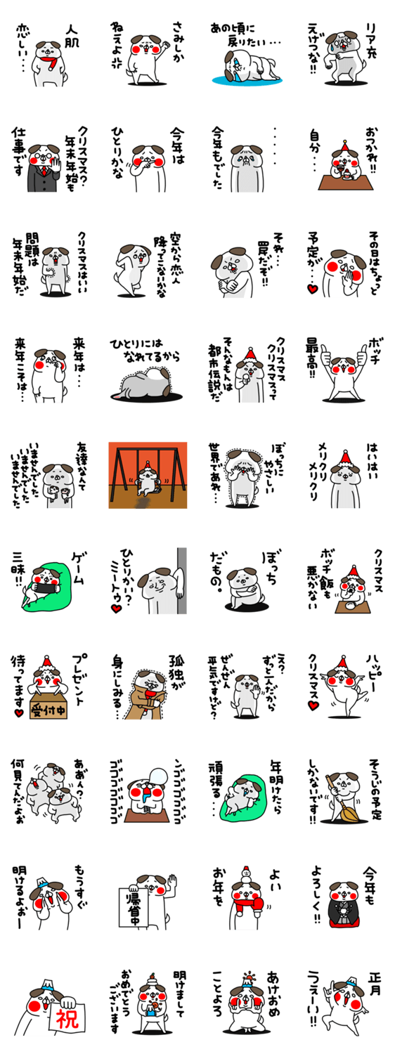 全力でうざい全力でおちょくるあざとかわいい犬の年末年始用。クリスマスや年末やお正月に使える人肌恋しい冬のスタンプ。孤独な人にもリア充にもおすすめ。