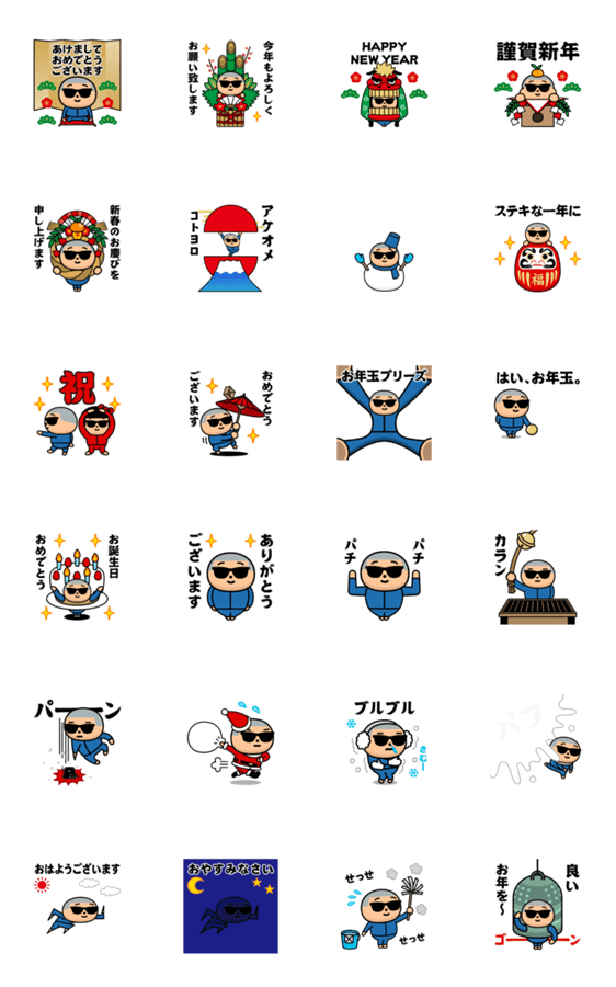 | スタンプ説明 | グラサンファミリー/サングラスボーイ/男子/少年/男の子/大人男子/メンズ/お祝い/年末年始/お正月/謹賀新年/2025年/令和7年/迎春/大晦日/寿/祝日/お誕生日/冬/あけおめ |
