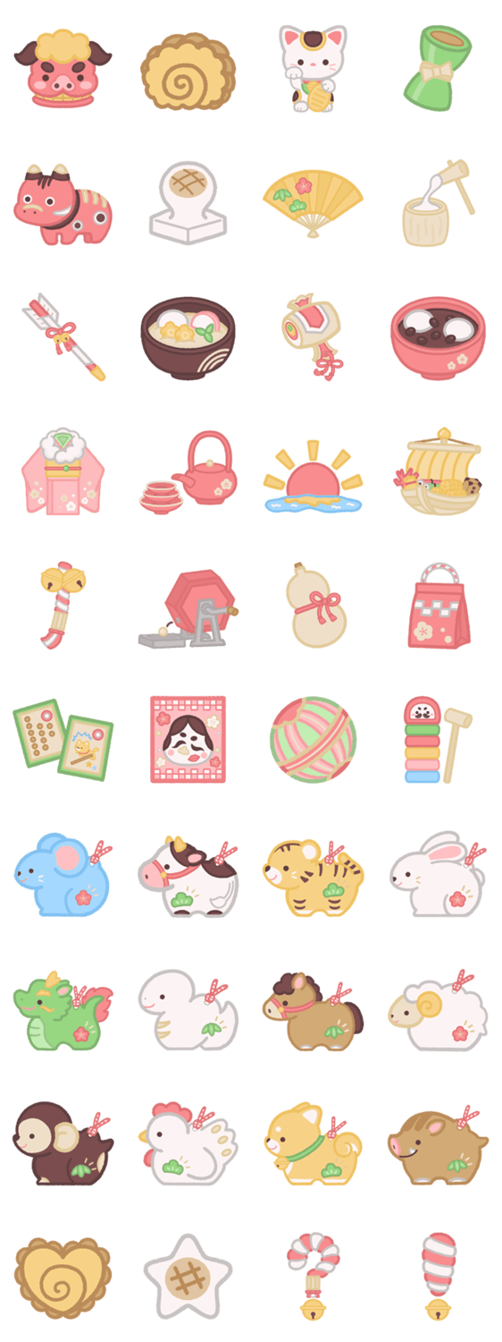 正月なアイテムを集めた文字なしスタンプです!【写真デコ/年末年始/冬/あけおめ/ニューイヤー/大晦日/新年/年越し/毎年/日本/干支/十二支/初夢/餅/福袋/手描き風/便利】