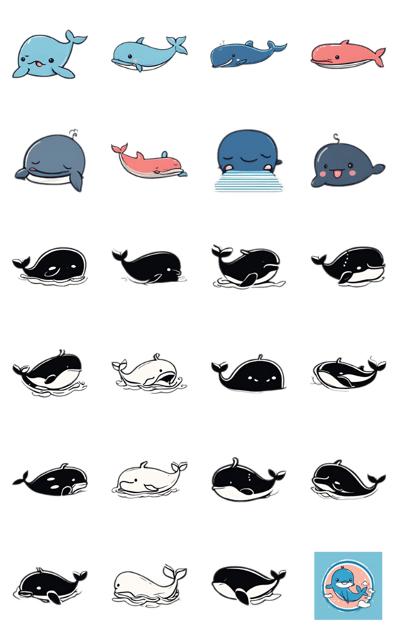 クジラのキャラクターやさしい小さいかわいい愛らしい嬉しい楽しいキュートシンプル素敵使いやすい使い勝手が良い色々な気持ち様々な感情あいさついろいろ盛り沢山いっぱい