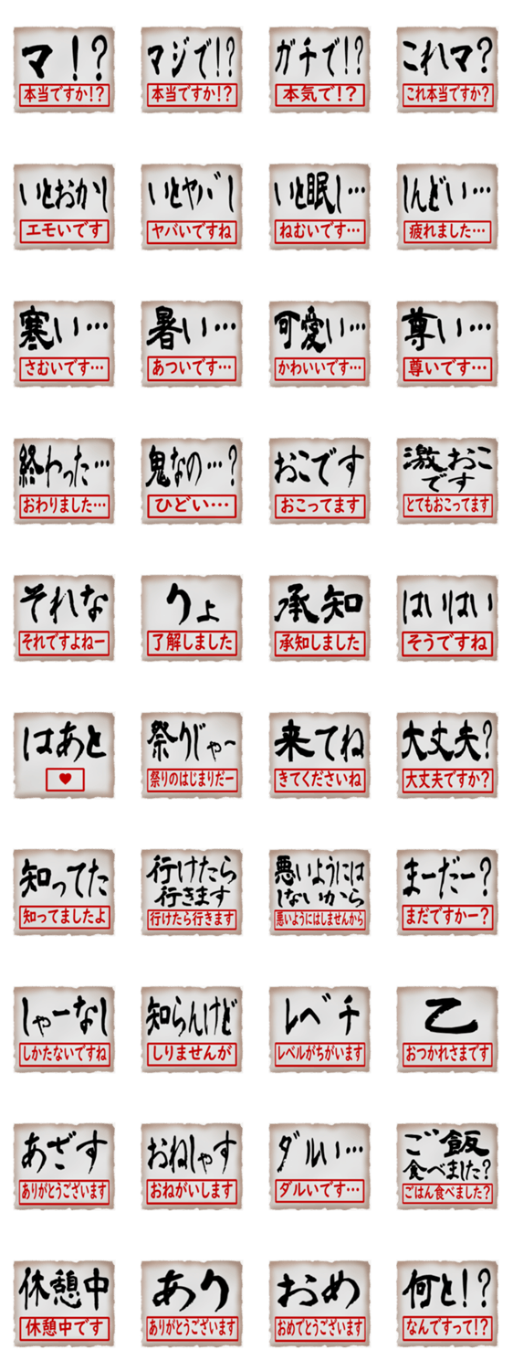 筆文字のスタンプです、第1弾、シンプルなので仕事で使いやすいです、下の部分には文章の読み方や意訳、今風な言い回しなどが書いてあります