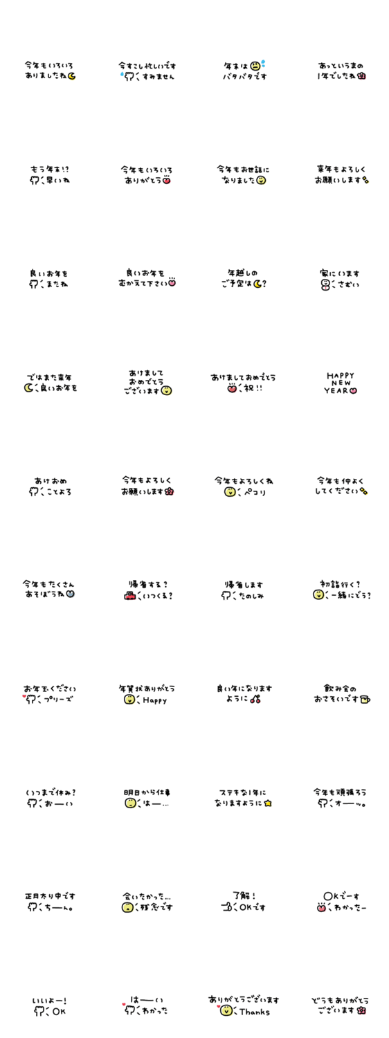 このスタンプは2024年の再販です。シンプルな省スペーススタンプです。 吹き出し/あいさつ/スマイル/ニコちゃん/年末年始