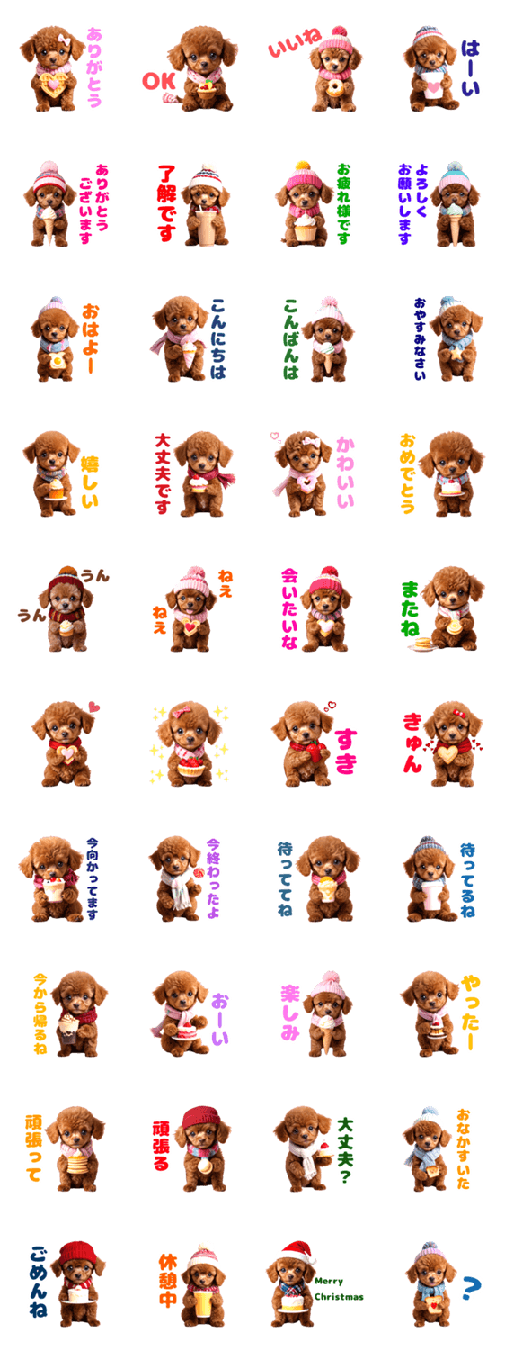 かわいいプードルの子犬が、食べ物をたくさん持ってもぐもぐしている姿がかわいいスタンプです♡(リアル、いぬ、ケーキ、マフラー、冬、イヌ)とてもおすすめです!